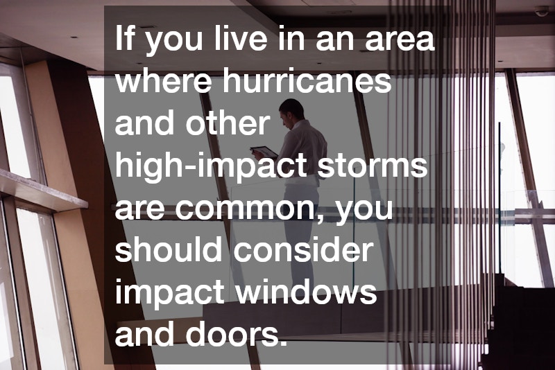 If you live in an area where hurricanes and other high-impact storms are common, you should consider impact windows and doors. According to CGI Windows, these windows and doors are specially designed to withstand the force of high winds from storms like hurricanes and tornados. The same website reports that these doors and windows typically contain a laminated layer of glass that is less likely to shatter during storms.
